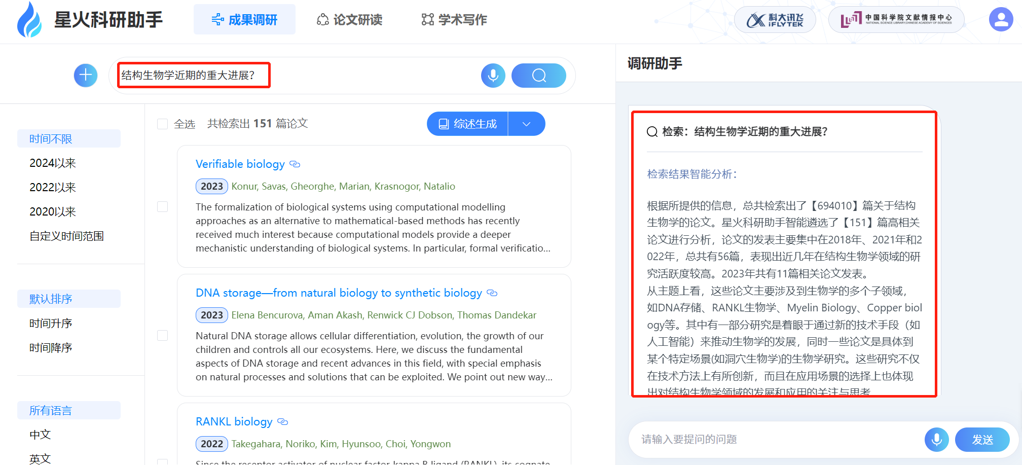 2.在星火科研助手中输入搜文献的相关问题,如“结构生物学近期的重大进展?”该工具则从语义解析关键词并查询相关的论文。