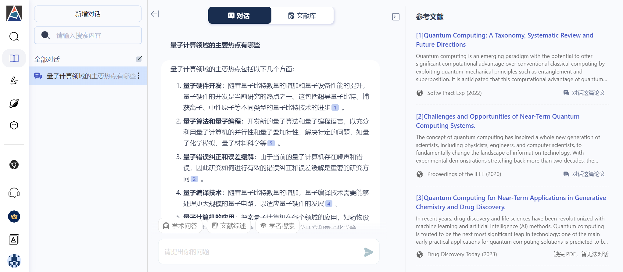 2.结果页面快速回答出量子领域的主要热点,同时针对每个子领域给出其定义的参考文献来源,右侧也给出了一些参考文档可点击查看或与文献对话。